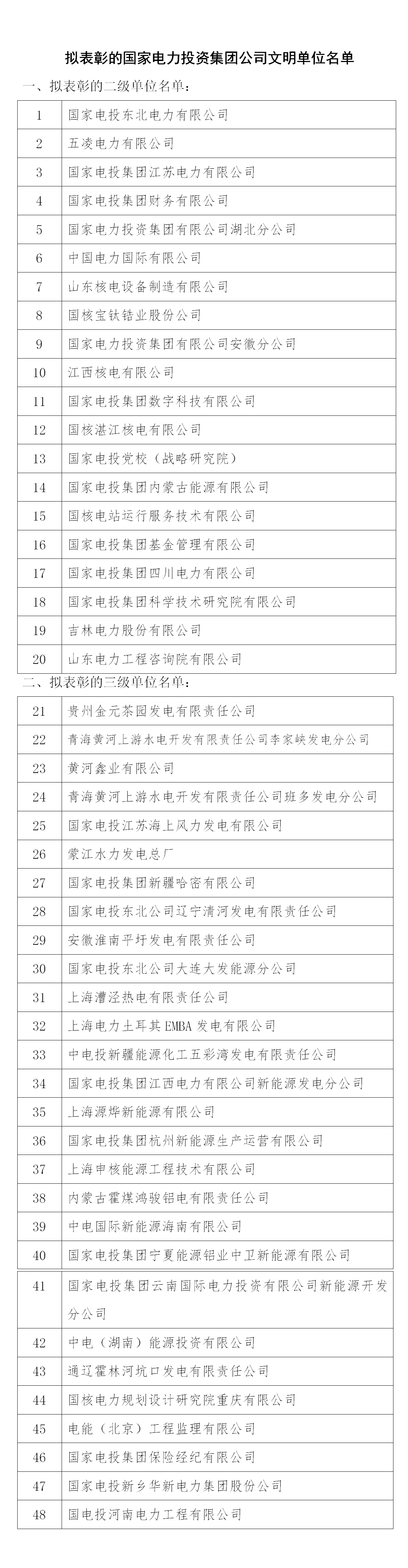 根據(jù)《國家電力投資集團有限公司文明單位建設(shè)管理辦法》相關(guān)要求,現(xiàn)將擬表彰的國家電力投資集團公司文明單位名單予以公示。公示期間,如對擬表彰單位有異議,可通過電子郵箱、電話等方式向集團公司宣傳與群團部實名反映(注明真實姓名、聯(lián)系方式)。反映的情況要客觀真實、實事求是,對線索不清的匿名反映不予受理。