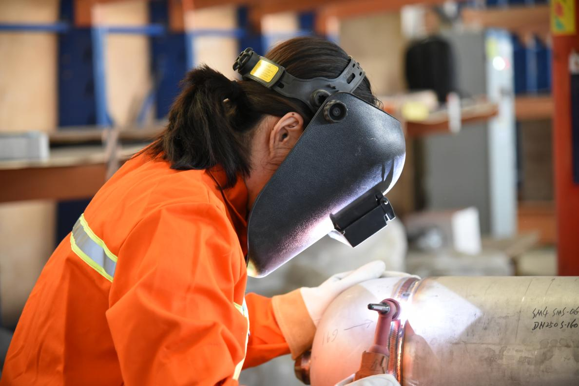 技藝精進(jìn)的同時(shí),徐穎慧不忘大膽創(chuàng)新。在管道氬弧焊(鎢極惰性氣體保護(hù)電弧焊)過程中,為了保護(hù)不銹鋼管道焊縫不被氧化,焊工們需要在焊接前向管內(nèi)充入惰性氣體——?dú)鍤,并封堵管道兩端后再進(jìn)行焊接。封堵管道口所用的工具是車間清潔用的棉布。焊接過程中,徐穎慧發(fā)現(xiàn)隨著焊接位置的變化,焊接試件在轉(zhuǎn)動時(shí)棉布極易脫落和燃燒。沒有了氬氣保護(hù),焊縫就不合格,產(chǎn)品又要重新返工。“相當(dāng)于白干,不僅我自己遇到這樣的情況,我的同事也遭受過同樣的問題,為什么不做幾套工具把棉布替換掉呢?”她在心里盤算著。徐穎慧參照不同規(guī)格管道的尺寸,用不銹鋼制作了一整套充氬工裝!拔揖褪前严敕涞兀尯罄m(xù)的焊接更高效更方便!闭沁@個(gè)不起眼的“小改良”,在后續(xù)生產(chǎn)中為企業(yè)節(jié)約了三分之一的氬氣,使生產(chǎn)流程變得更為安全可控,進(jìn)一步保證了產(chǎn)品的焊接質(zhì)量。
