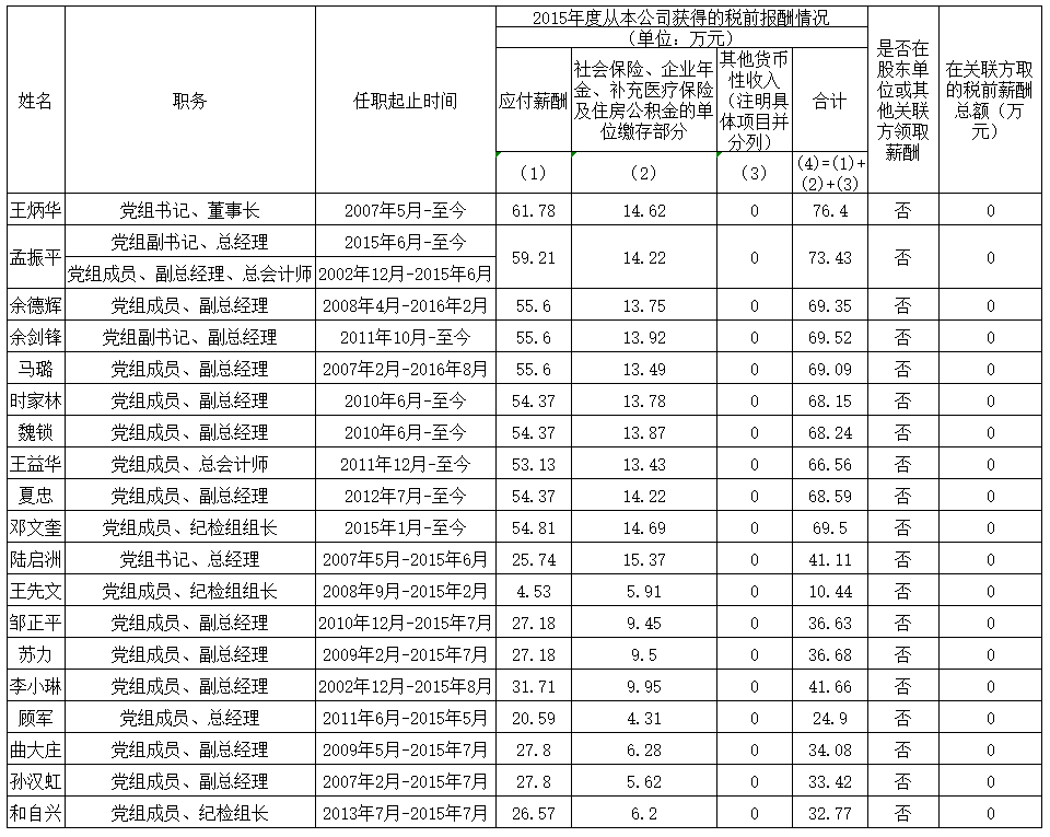 備注:上表披露信息為我公司企業(yè)負(fù)責(zé)人2015年度全部應(yīng)發(fā)稅前薪酬,按國家規(guī)定由單位繳存各種社會保險(xiǎn)等。其中,第(1)項(xiàng)由國務(wù)院國資委核定。
