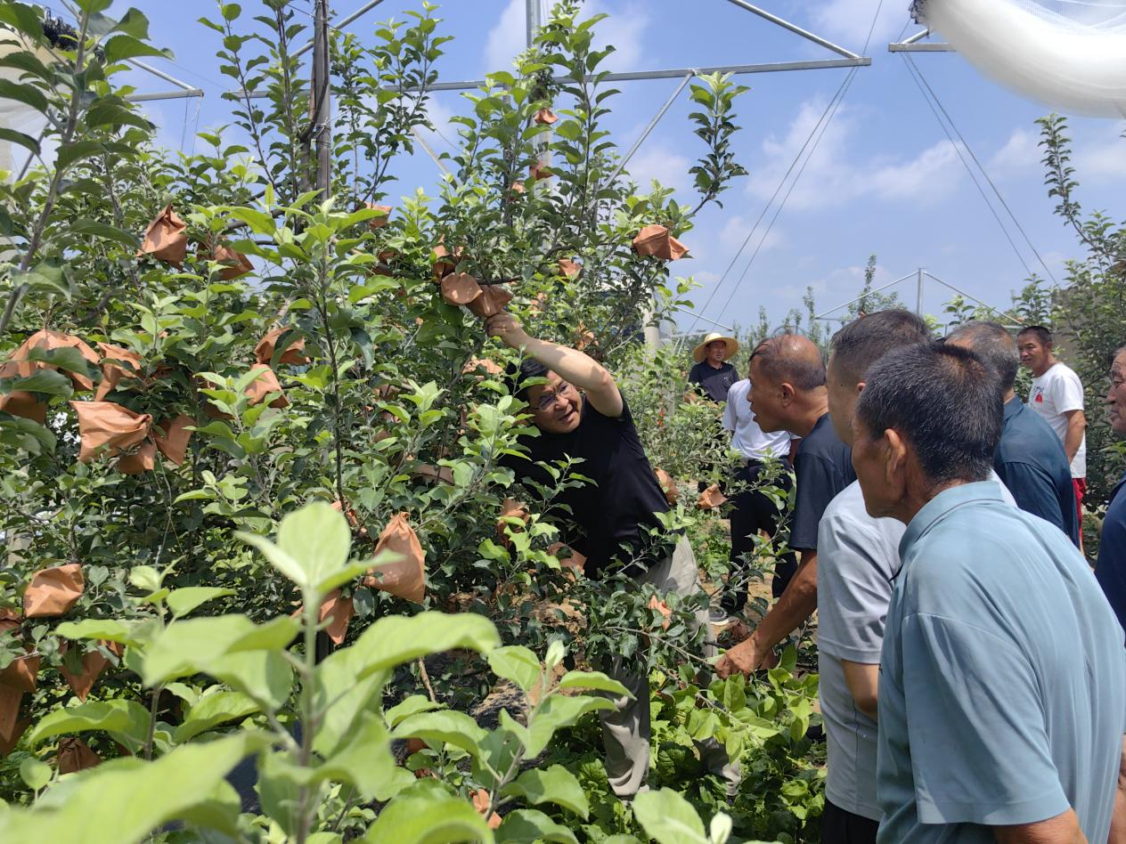 黨校組織中國農(nóng)科院果樹所與當?shù)貙<以谔O果種植基地開展現(xiàn)場教學,講解果樹種植技術(shù)和修剪手法。