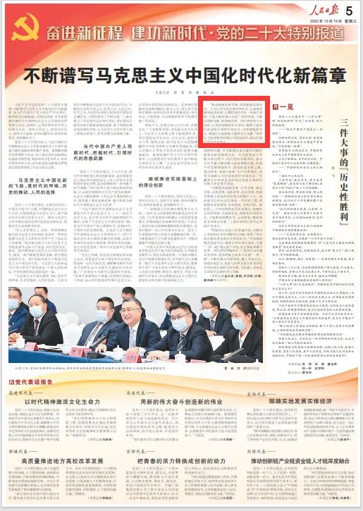 10月19日,《人民日?qǐng)?bào)》“奮進(jìn)新征程 建功新時(shí)代·黨的二十大特別報(bào)道”專版頭條刊發(fā)《不斷譜寫馬克思主義中國(guó)化時(shí)代化新篇章》。報(bào)道中,國(guó)家電力投資集團(tuán)有限公司黨組成員、副總經(jīng)理盧洪早代表表示:“抓創(chuàng)新就是抓發(fā)展,謀創(chuàng)新就是謀未來。只有以科學(xué)的態(tài)度對(duì)待科學(xué)、以真理的精神追求真理,以滿腔熱忱對(duì)待一切新生事物,才能不斷拓展認(rèn)識(shí)的廣度和深度,不斷實(shí)現(xiàn)新突破、取得新成果。我們將堅(jiān)持守正創(chuàng)新,以國(guó)家戰(zhàn)略需求為導(dǎo)向,集聚力量進(jìn)行原創(chuàng)性引領(lǐng)性科技攻關(guān),為保障能源安全、增強(qiáng)自主創(chuàng)新能力提供有力支撐!币韵聻閳(bào)道全文: