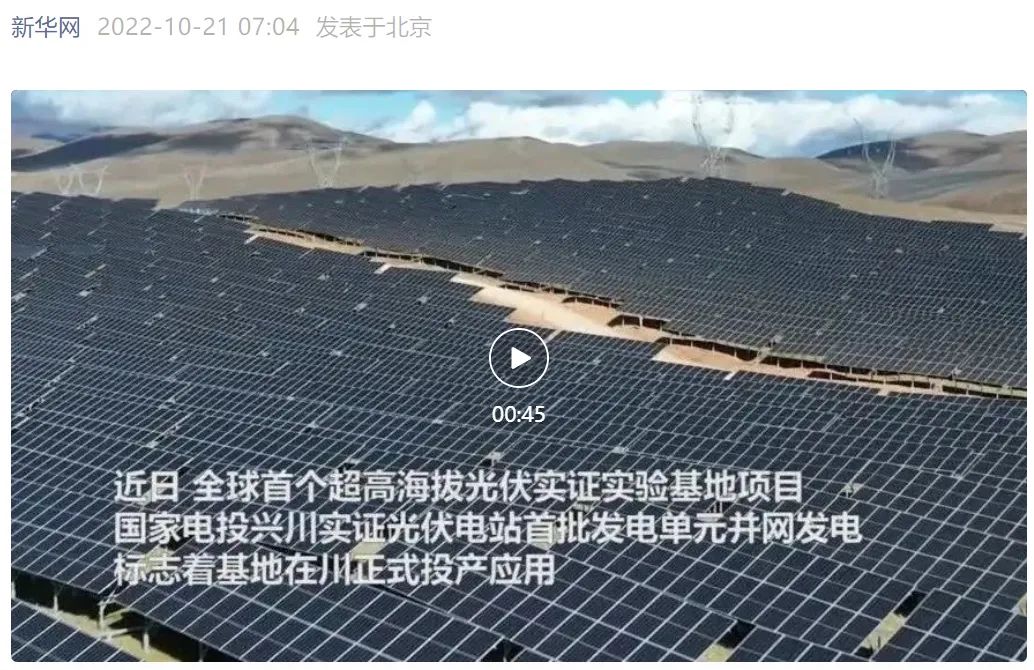 10月21日,新華網(wǎng)官方微信號刊發(fā)《全球首個,正式投產(chǎn)!》一文,3小時閱讀量10萬+。報道稱,超高海拔光伏實證實驗基地項目——國家電投興川實證光伏電站首批發(fā)電單元并網(wǎng)發(fā)電,標志著四川甘孜州興川光伏實證實驗基地正式投產(chǎn)應用。電站投運后將填補我國光伏實證基地在超高海拔、中緯度地區(qū)的空白,為川藏高原以及全國范圍內(nèi)相似場景地區(qū)的光伏建設(shè)提供參考。以下為報道全文: