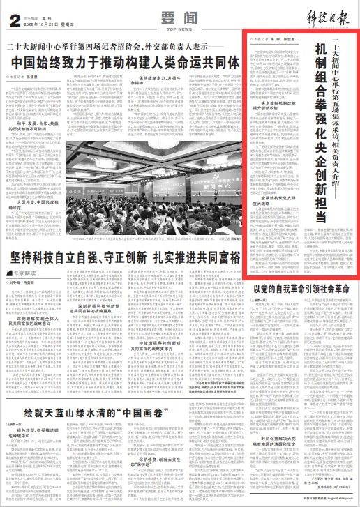 10月20日,《科技日報》要聞版刊發(fā)《機制組合拳強化央企創(chuàng)新?lián)敗,對國家電投黨組書記、董事長錢智民等黨員代表在二十大新聞中心集體采訪觀點進行報道。訪談中,錢智民介紹了央企科技創(chuàng)新發(fā)展成就,并以“重型燃氣輪機”國家科技重大專項為例,講述國家電投在勇當原創(chuàng)技術策源地和現(xiàn)代產(chǎn)業(yè)鏈“鏈長”中發(fā)揮的重要作用。以下為報道全文: